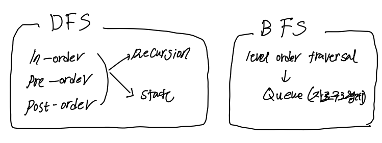 내가 처음에 배웠던 1) In-order, 2) pre-order, 3) post-order 알고리즘의 개념은 DFS로 속하고 4) level-order traversal(Queue)를 사용하는것은 BFS 개념에 속한다. 이때 1,2,3) 알고리즘은 Recursion을 사용하지만 Stack을 사용해서도 나타낼 수 있다.
