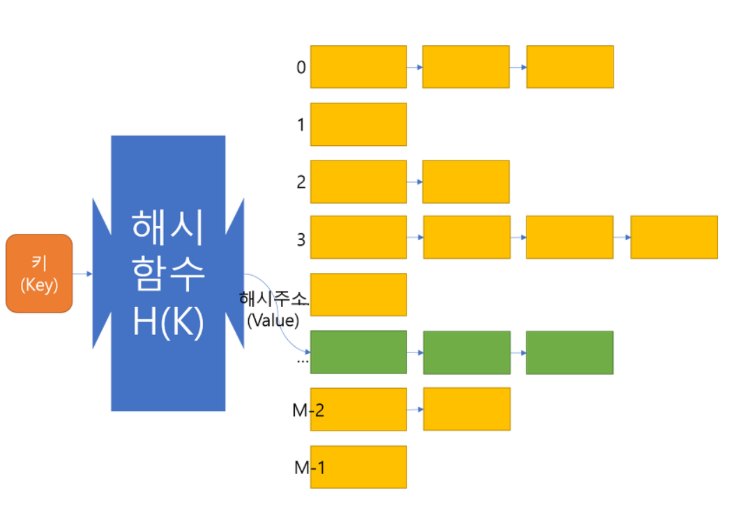 - 근데 만약 두개 다른 key가 같은 value를 지칭하게 된다면? -> 충돌. 이를 해결하기위해 체이닝(chaining기법을 사용)