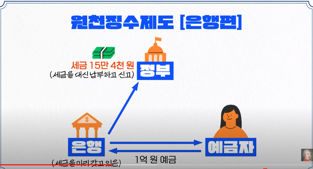 - 예로 국세 14% 지방세는 국세에서10%로 (예금자한테는1.4%) 예금자는 총 15.4%를내야해함 . 은행이 이를 대신 국가에내는게 원천징수제도