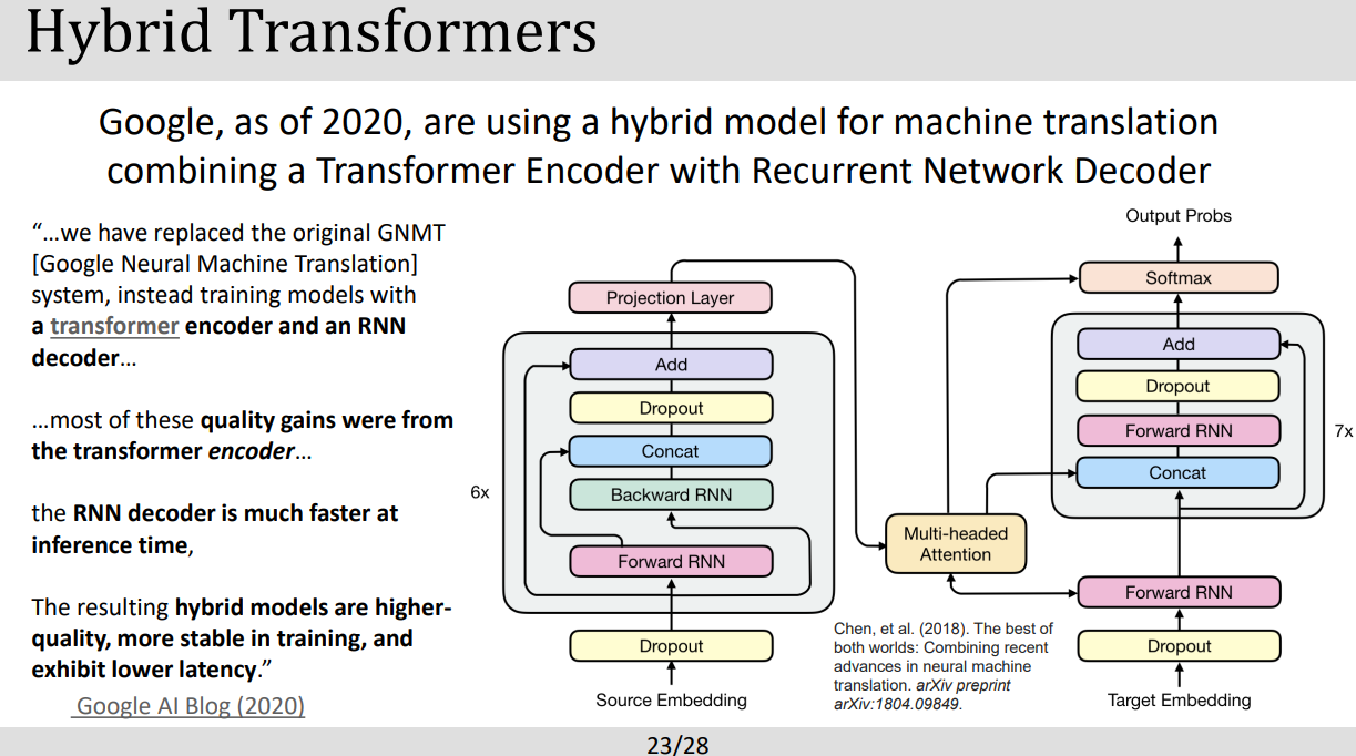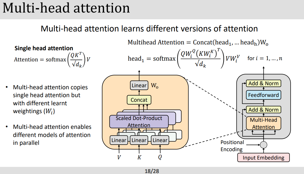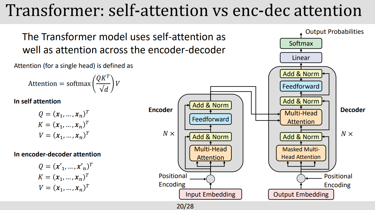 - Attention model은 3가지 중요 요소로 이루어져있는데 query, key, value vectors들로 이루어져있다. query vector는 디코더 안에있는 현재의 위치를 표현하고 key,value vector들은 엔코더안에서의 위치나 디코더에서 그 이전 위치를 가르킨다.