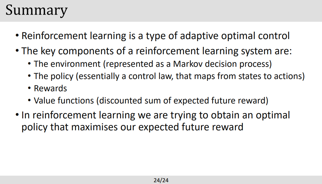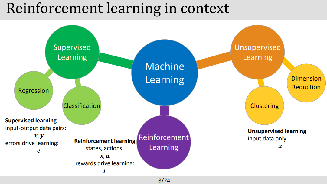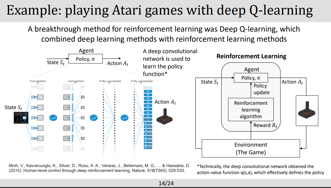 - Reinforcement learning 의 큰 구성요소는 states, action, reward ; 어떤 조작키를 눌러서, 어떤 행동을 하고, 이에 맞는 피드백를 얻는다.