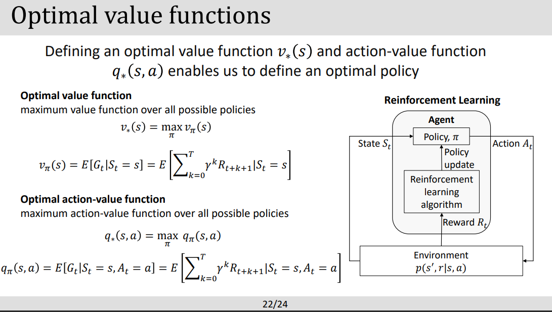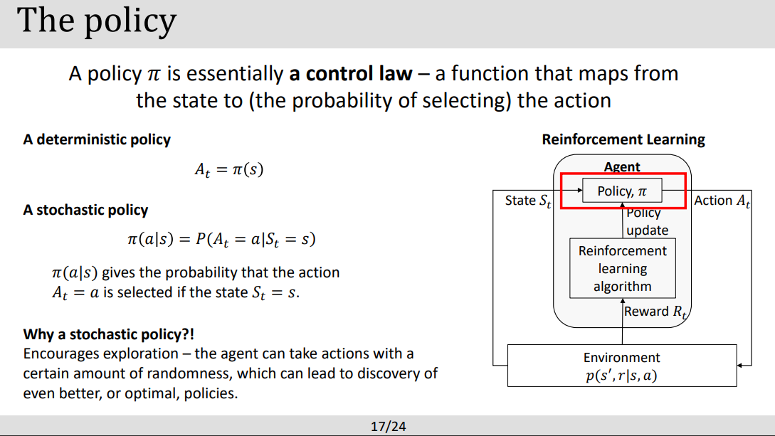 - policy 파이 는 state가 어떻게 action에 배정되는지 결정해준다.