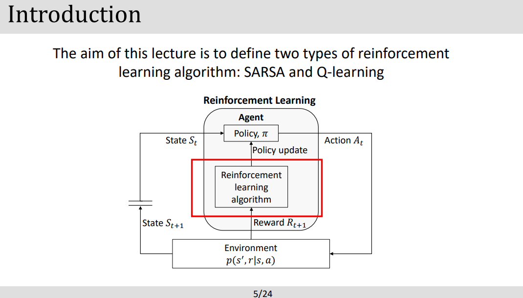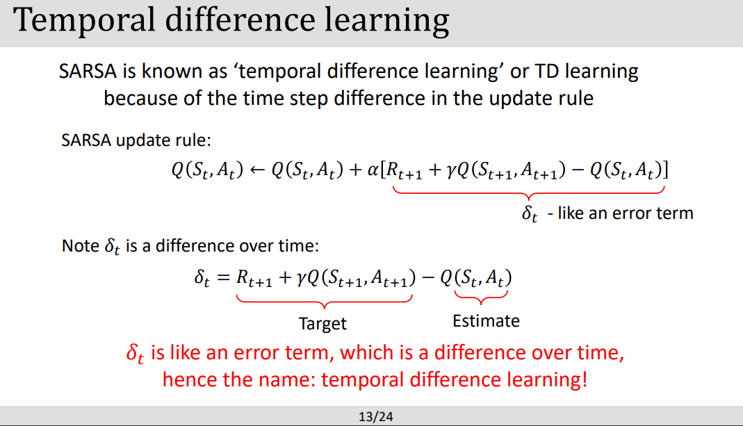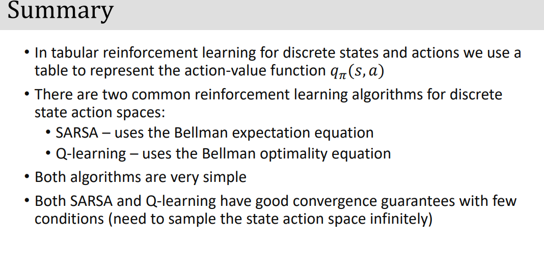 - SARSA (State- Action- Reward- State -Action) 는 all in one package 로 생각하면 쉽다. model-free method를 사용하여 optimal policy를 바로 학습하며 환경모델이 필요하지않다. SARSA는 state -acition인 Q value를 관측된 reward와 state-action pair로 예측하며 agent가 학습을 진행한다. => 사건으로 학습진행, 어려운 모델 몰라~