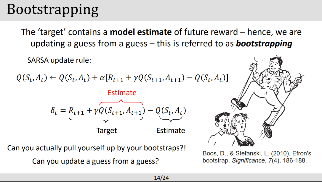 - 여기서 bootstrapping이란 비유는 자기 손으로 직접 처리하는 의미여서 SARSA가 외부의 도움을 받지않고 model Estimate를 한다는 뜻에서 사용.