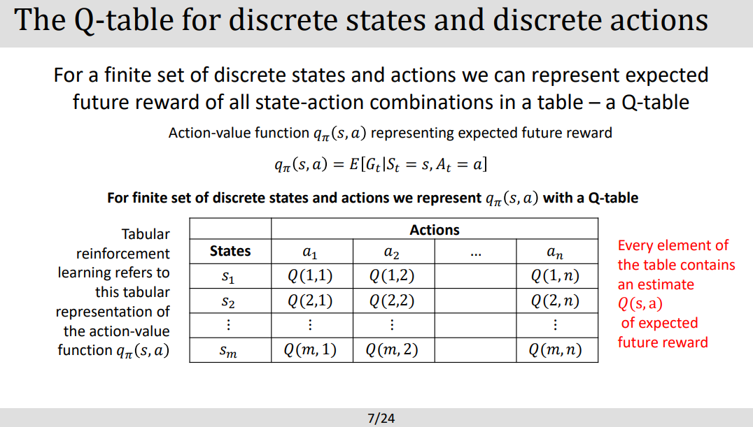 - Tabular methods는 강화학습에서 Q-Table을 사용해 각 state-action pair를 discrite하게 테이블에 저장하는 방법이다.