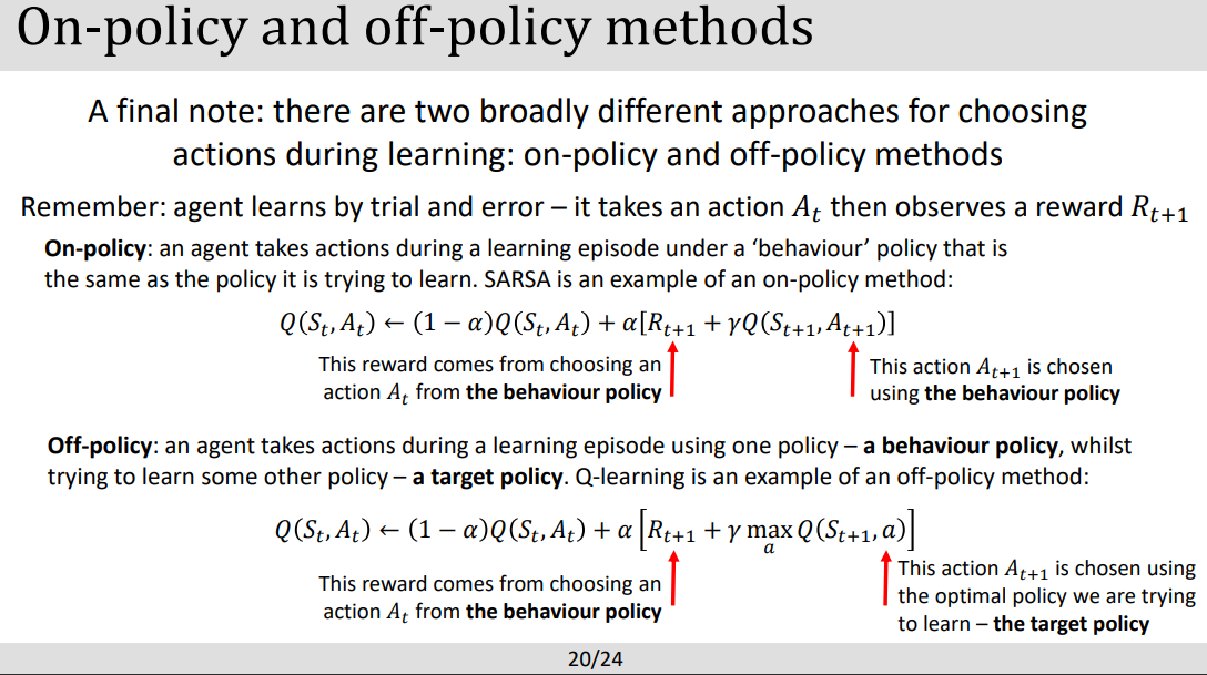 - On-policy vs Off-policy : on-policy는 current policy's data에 의해 학습, off-policy는 다른 policy에 의해 생성된 데이터로 학습하는 차이