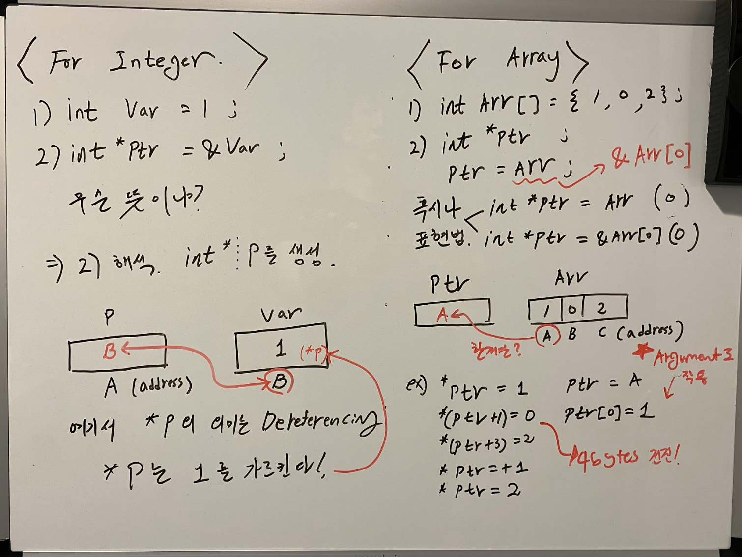 Point 가 메모리 기반으로 작동되고 일반 interger variable 을 다룰때와 Array 를 다룰때 좀 더 볶잡해지는 경우가 있다.. 일단 Array를 지칭하는 포인터는 여기까지하고... 차근차근 하면서 공부해야겠다. 좀더 알았던 사실들은 Pointer가 Array를 자체를 가르키는 경우 Arr[0]의 주소를 가르키게되고 표현하면 int (*Ptr)[5] 로 선언이 되며 Ptr =&arr 로 이닛이 된다.