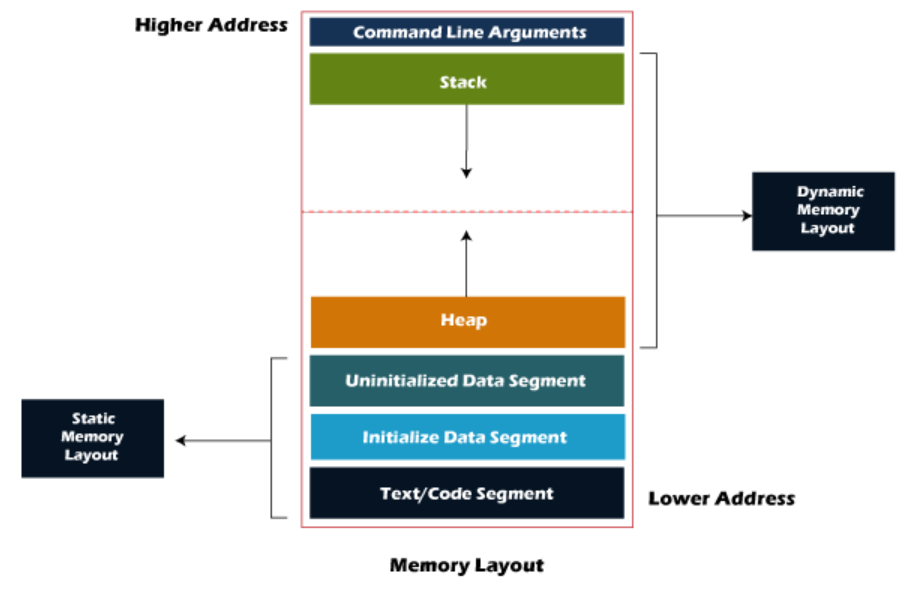여기까지가 static memory layout. 즉 컴파일링할때 이미 정해진 영역