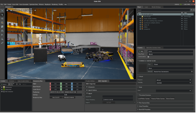 아이작 심은 네이비게이션과 매니퓰레이터 를 ROS1/2를 통해 서포트할 수 있고 여러 센서들!(Lidar, camera ,Imu etc)등 을 시뮬레이션 할 수 있다. (너무 리얼해보이네)